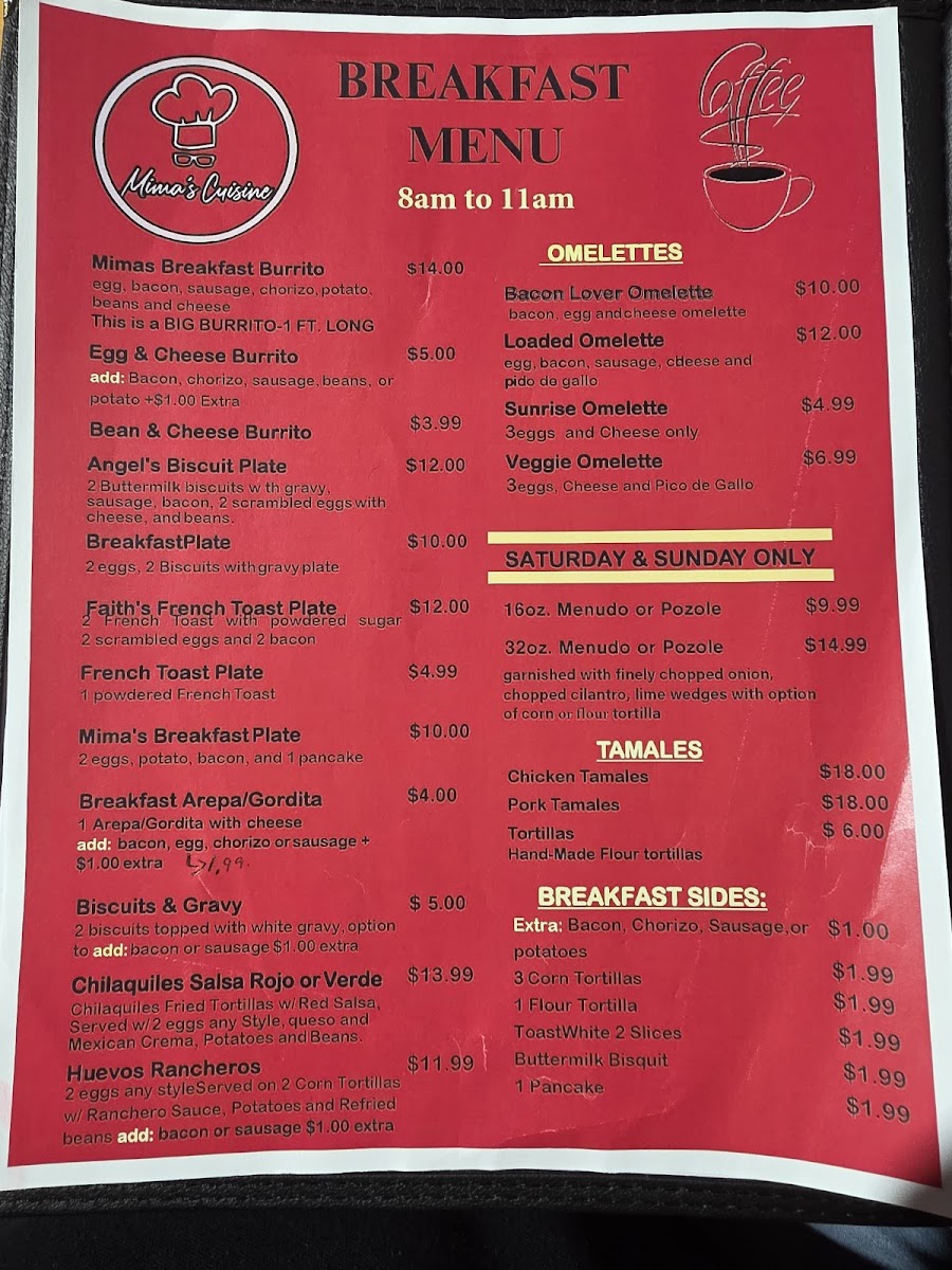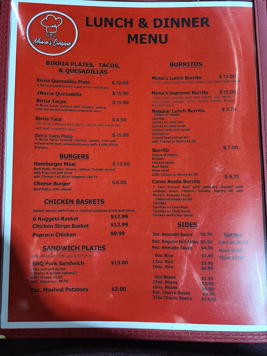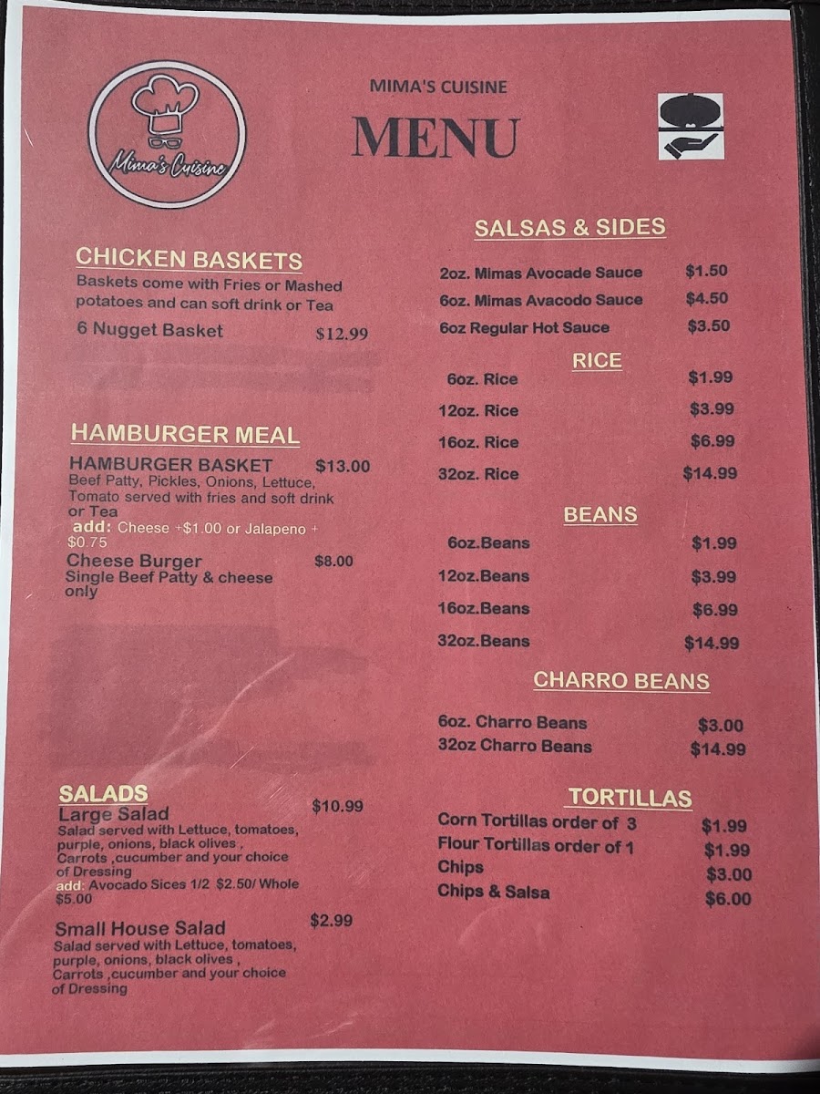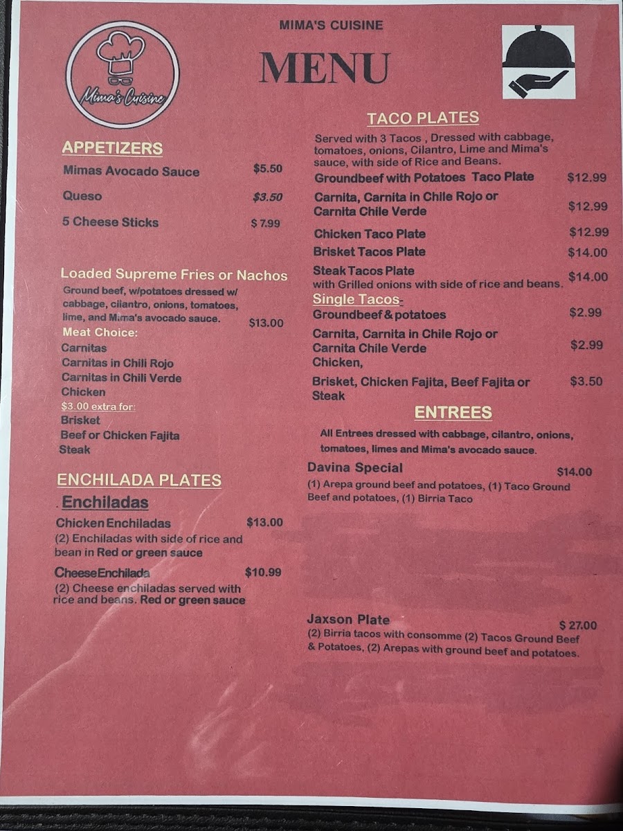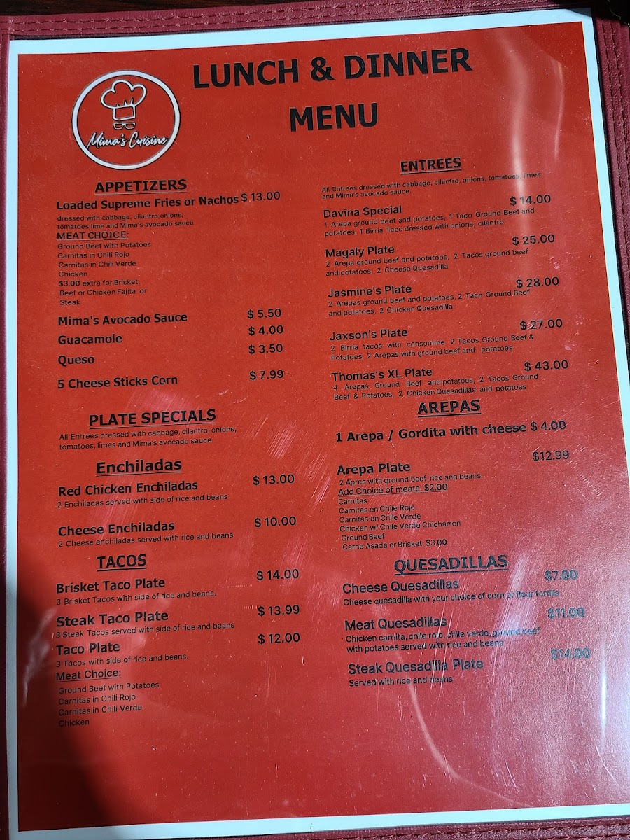 From a reviewer’s perspective, the menu at Mima's Cuisine is a rich and comforting summary of traditional Mexican and Tex-Mex flavors, offering something satisfying for every time of day. The variety of Taco Plates stands out, ranging from Groundbeef With Potatoes Taco Plate, Carnita, Carnita In Chile Rojo Or Carnita Chile Verde, and Chicken Taco Plate to heartier options like Brisket Tacos Plate and Steak Tacos Plate, all designed as filling, well-rounded meals. Starters such as Mimas Avocado Sauce, Queso, and 5 Cheese Sticks set the tone with familiar, crowd-pleasing flavors, while signature Entrees like Davina Special and Jaxson Plate add a personal touch to the menu. Comfort classics continue with Chicken Enchiladas and Cheese Enchilada, balanced nicely by lighter choices like Large Salad and Small House Salad. The essentials are well covered too, from Corn Tortillas Order Of 3, Flour Tortillas Order Of 1, and Chips & Salsa to indulgent desserts such as Sopapilla and Cheese Pie With Strawberries. Beverage options are extensive, including Mexican Bottled Soda, Sangria, Manzanita Sol, Coke 16oz Plastic Bottled, Bottled Water, along with Sweet Ice Tea Juice. The menu also highlights regional favorites like Arepas Gordita With Cheese and Arepa Plate, plus satisfying Quesadillas Singles such as Cheese Quesadilla Single and Ground Beef & Cheese Quesadilla, and full Quesadillas Plates including Carnita Quesadilla Plate, Carnita C/ Chile Rojo Plate, and Carnita C/ Chile Verde Plate. Breakfast lovers are well served with Bacon Lover Omelette, Loaded Omelette, Sunrise Omelette, Veggie Omelette, Mima's Breakfast Burrito, and classic Breakfast Sides like 3 Corn Tortillas, 1 Flour Tortilla, Toastwhite 2 Slices, Buttermilk Bisquit, and 1 Pancake. Weekend specialties such as 16oz. Menudo Or Pozole and 32oz. Menudo Or Pozole, alongside Chicken Tamales and Pork Tamales, give the menu an authentic, home-style finish. Overall, Mima’s Cuisine delivers a generous, thoughtfully assembled menu that reflects comfort, tradition, and variety in every category.