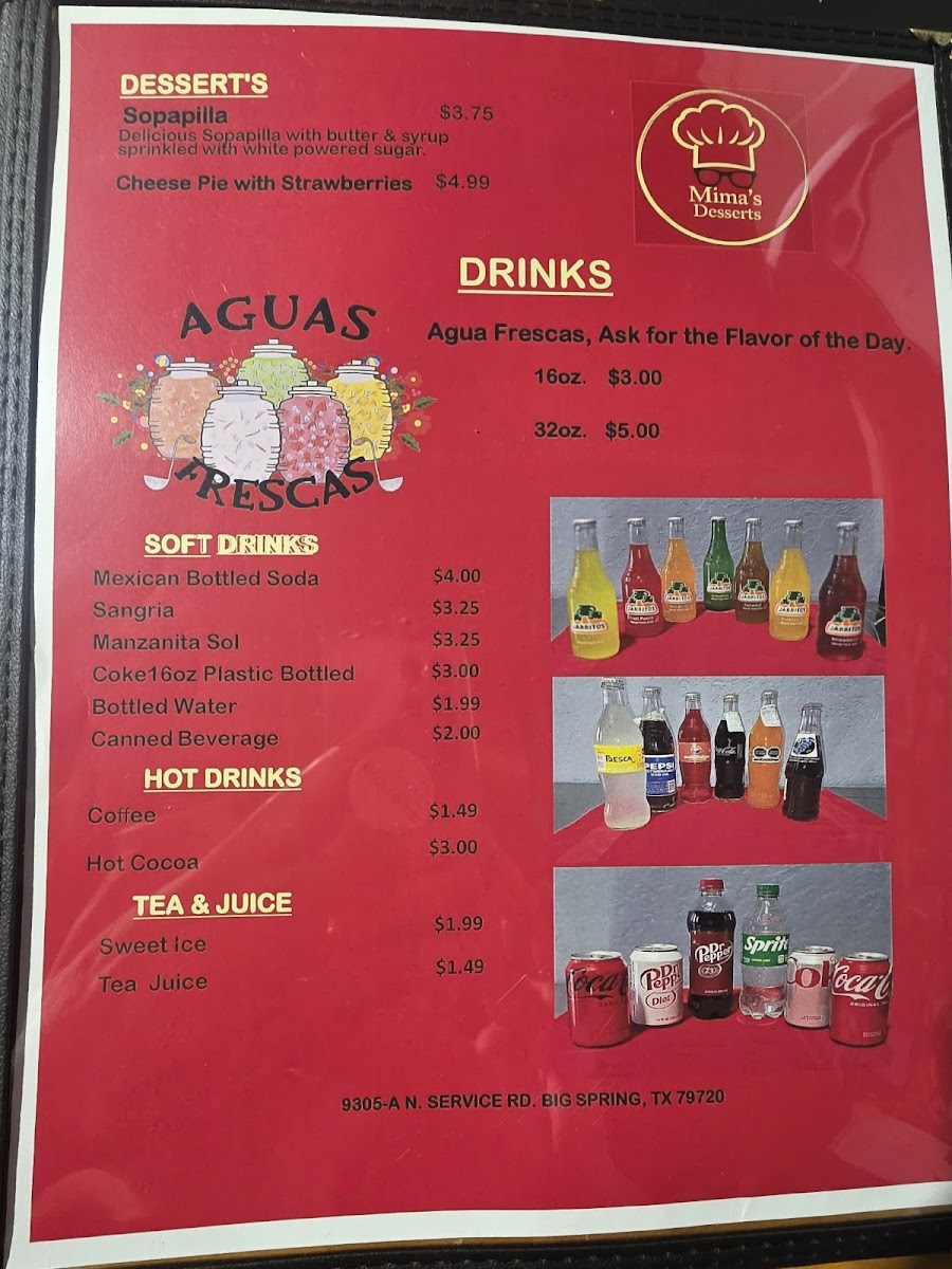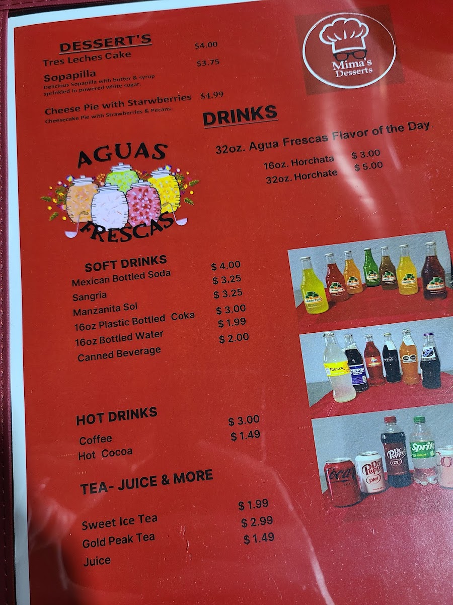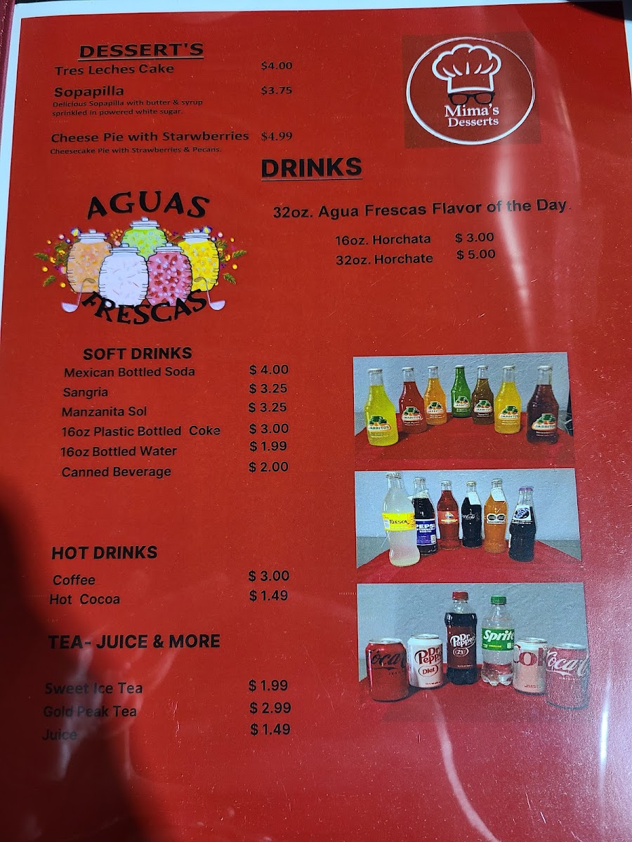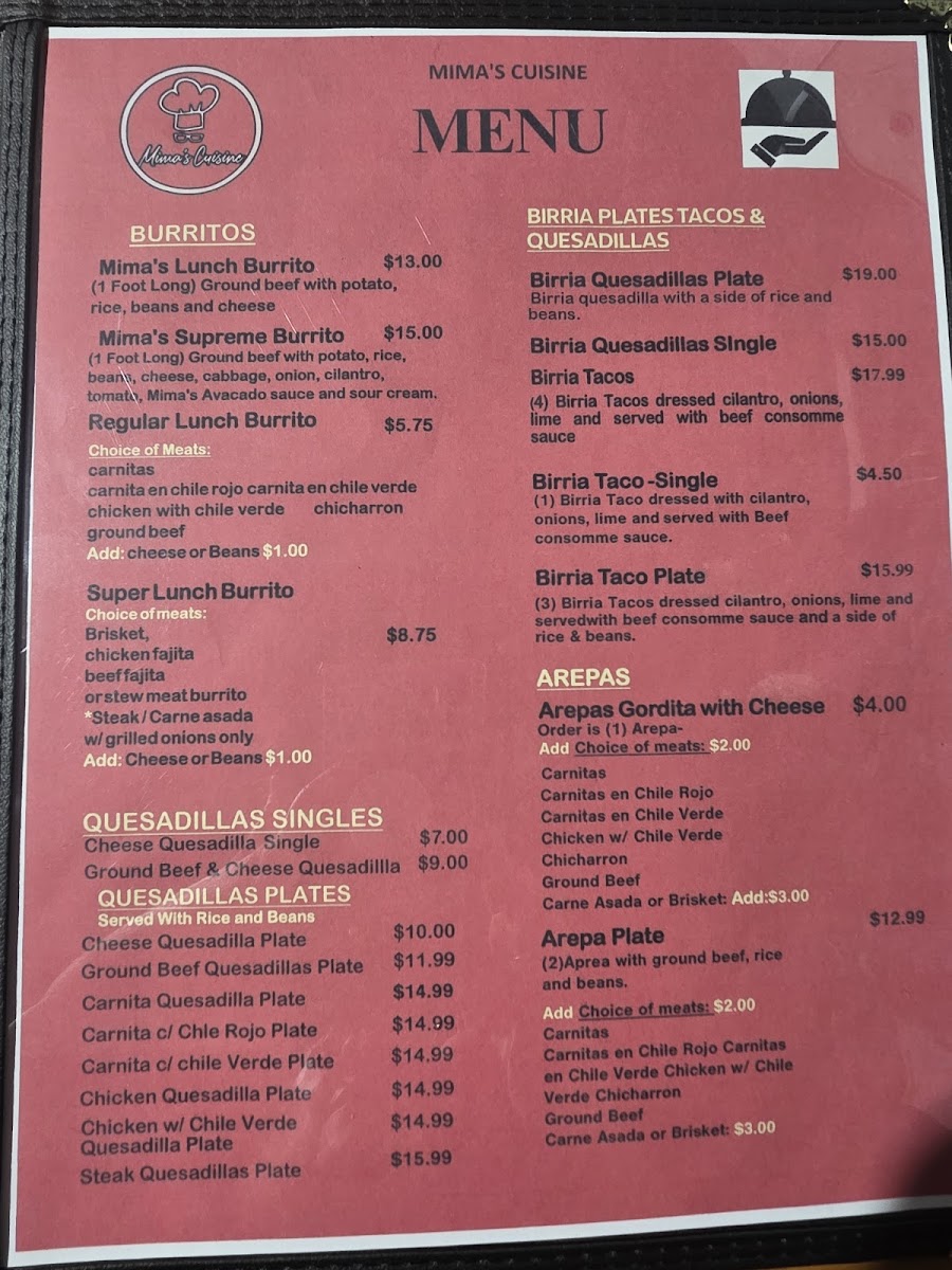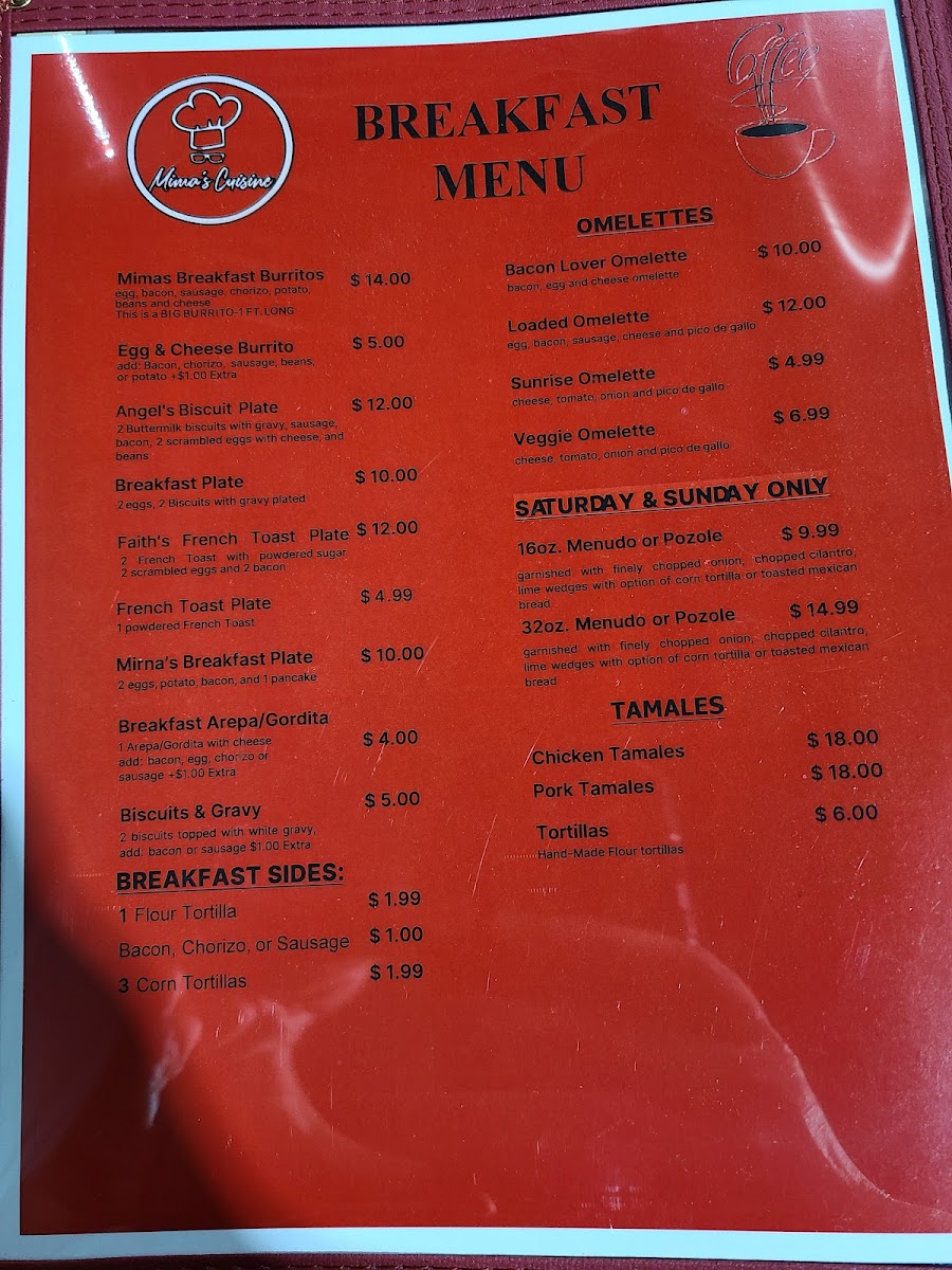 From a reviewer’s perspective, the menu at Mima's Cuisine is a rich and comforting summary of traditional Mexican and Tex-Mex flavors, offering something satisfying for every time of day. The variety of Taco Plates stands out, ranging from Groundbeef With Potatoes Taco Plate, Carnita, Carnita In Chile Rojo Or Carnita Chile Verde, and Chicken Taco Plate to heartier options like Brisket Tacos Plate and Steak Tacos Plate, all designed as filling, well-rounded meals. Starters such as Mimas Avocado Sauce, Queso, and 5 Cheese Sticks set the tone with familiar, crowd-pleasing flavors, while signature Entrees like Davina Special and Jaxson Plate add a personal touch to the menu. Comfort classics continue with Chicken Enchiladas and Cheese Enchilada, balanced nicely by lighter choices like Large Salad and Small House Salad. The essentials are well covered too, from Corn Tortillas Order Of 3, Flour Tortillas Order Of 1, and Chips & Salsa to indulgent desserts such as Sopapilla and Cheese Pie With Strawberries. Beverage options are extensive, including Mexican Bottled Soda, Sangria, Manzanita Sol, Coke 16oz Plastic Bottled, Bottled Water, along with Sweet Ice Tea Juice. The menu also highlights regional favorites like Arepas Gordita With Cheese and Arepa Plate, plus satisfying Quesadillas Singles such as Cheese Quesadilla Single and Ground Beef & Cheese Quesadilla, and full Quesadillas Plates including Carnita Quesadilla Plate, Carnita C/ Chile Rojo Plate, and Carnita C/ Chile Verde Plate. Breakfast lovers are well served with Bacon Lover Omelette, Loaded Omelette, Sunrise Omelette, Veggie Omelette, Mima's Breakfast Burrito, and classic Breakfast Sides like 3 Corn Tortillas, 1 Flour Tortilla, Toastwhite 2 Slices, Buttermilk Bisquit, and 1 Pancake. Weekend specialties such as 16oz. Menudo Or Pozole and 32oz. Menudo Or Pozole, alongside Chicken Tamales and Pork Tamales, give the menu an authentic, home-style finish. Overall, Mima’s Cuisine delivers a generous, thoughtfully assembled menu that reflects comfort, tradition, and variety in every category.